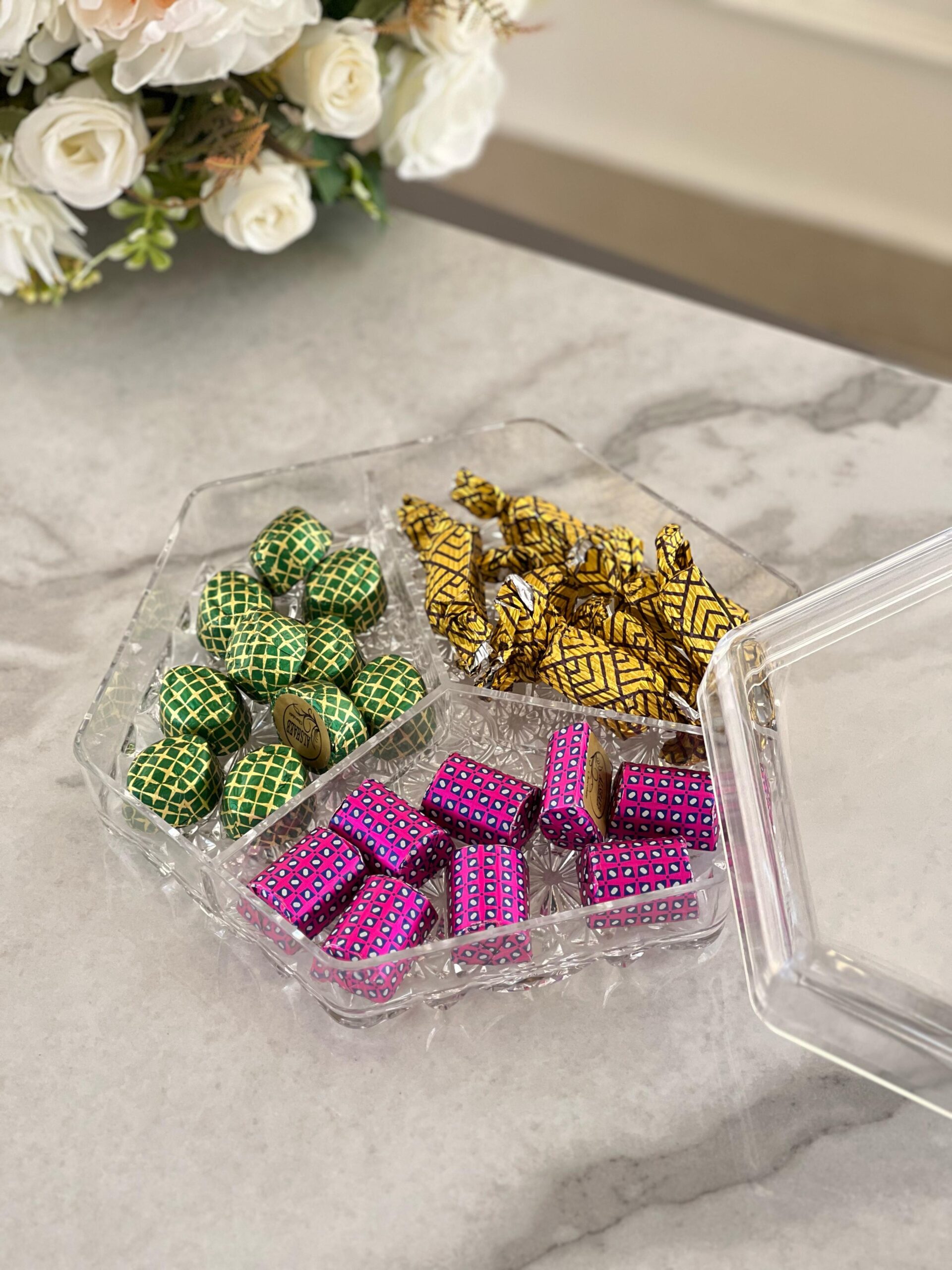 تصميم شفاف وأنيق بثلاث خانات لتقديم التمر، الشوكولاتة أو المكسرات بشكل مرتب ومنسّق ✨